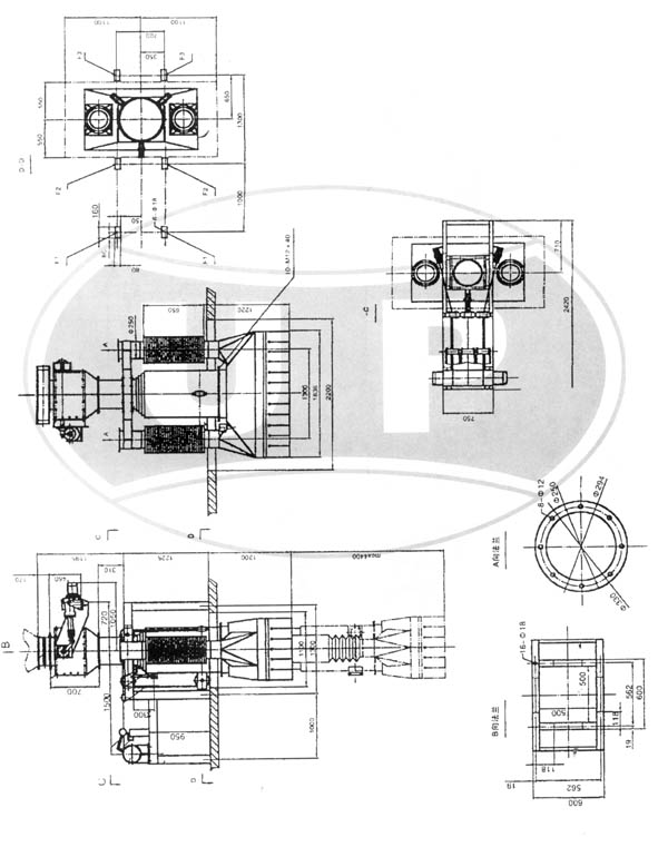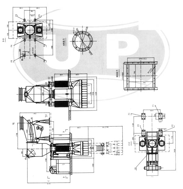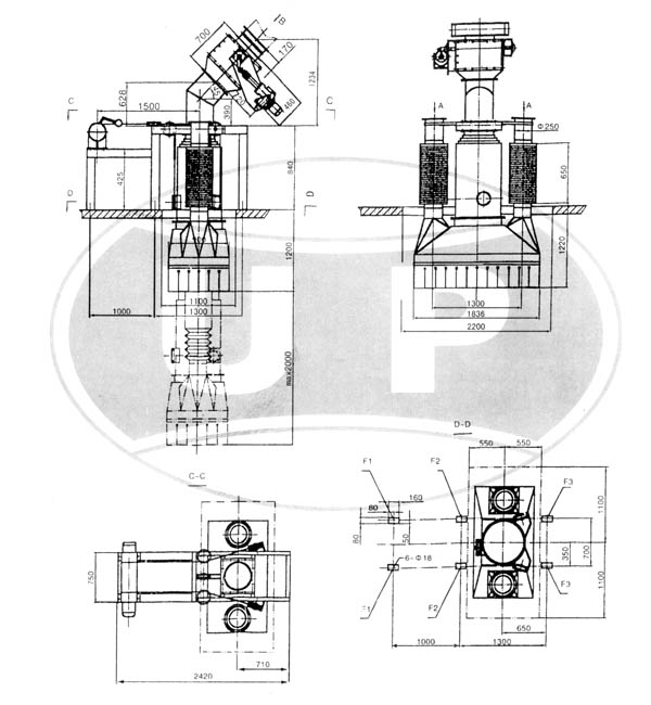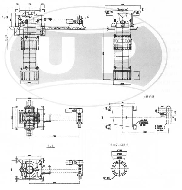 設(shè)備基礎(chǔ)及埋件載荷 1.提升裝置:FV=5KN×1.5 FH=20KN×2 2.進料口法蘭:FV=50KN 3.散裝頭基礎(chǔ):FV=4×10KN×15注四個柱腳止均為:10KN×1.5(系數(shù)) FV垂直載荷 FH為水平載荷 | 主要技術(shù)參數(shù) 1.Zui大卸料能力:200-300T/H 2.物料Zui大粒度:小于50mm 3.物料Zui高溫度:小于150° 4.含塵氣體排放量:4500m3/h 5.提升電機功率:2.2-3KW 6.設(shè)備自重:3000kg |