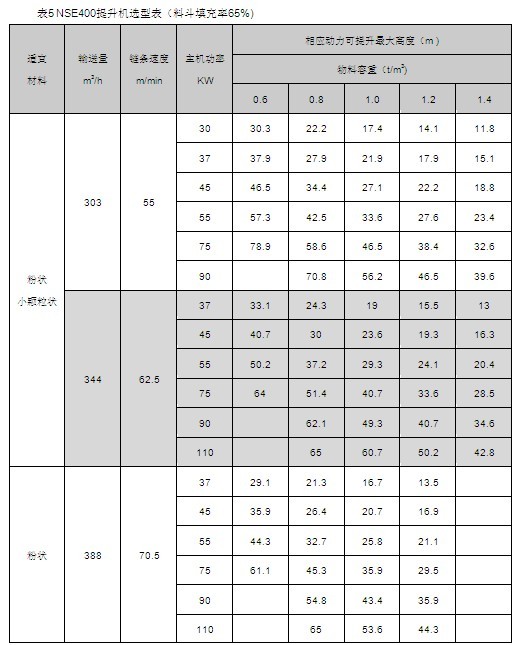 NSE系列高速板鏈斗式提升機(jī)共有九種基本型號(hào):NSE100、NSE200、NSE300、NSE400、NSE500、NSE600、NSE700、NSE800、NSE1000,每種型號(hào)根據(jù)輸送物料的不同,選擇不同的提升速度,提升速度上限<70m/min,提升高度上限65m。另外,奧普公司還可根據(jù)用戶要求輸送量介于上述型號(hào)之間的擴(kuò)展型號(hào)。