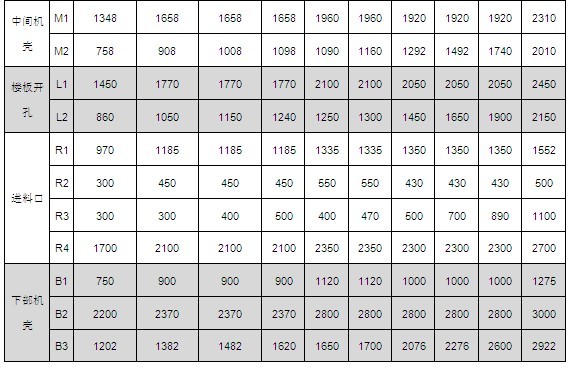 中部機(jī)殼--分為與上部裝置聯(lián)接的帶支撐中間節(jié)、帶檢視門中間節(jié)、標(biāo)準(zhǔn)中間節(jié)(均為 3.0米高)和非標(biāo)準(zhǔn)中間節(jié)。