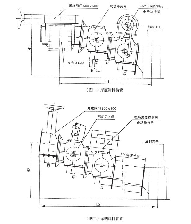 庫底卸料裝置由庫底螺旋閘門、庫底分料箱、電動(氣動)開關(guān)閥、電動流量控制閥及卸料溜子組成(見圖一),用于水泥生料粉或水泥的庫底卸料。庫底卸料裝置能自動調(diào)節(jié)卸料流量且均勻,其結(jié)構(gòu)合理,操作維護(hù)簡單方便,可設(shè)三個卸料口,用戶也可選用庫側(cè)卸料裝置(見圖二)。